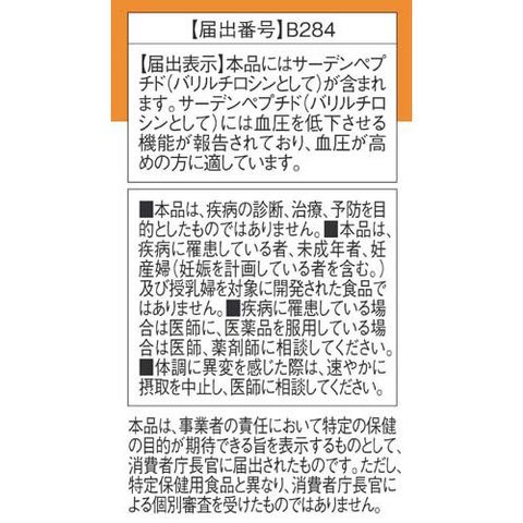 届出表示:本品にはサーデンペプチド(バリルチロシンとして)が含まれます。サーデンペプチド(バリルチロシンとして)には血圧を低下させる機能が報告されており、血圧が高めの方に適しています