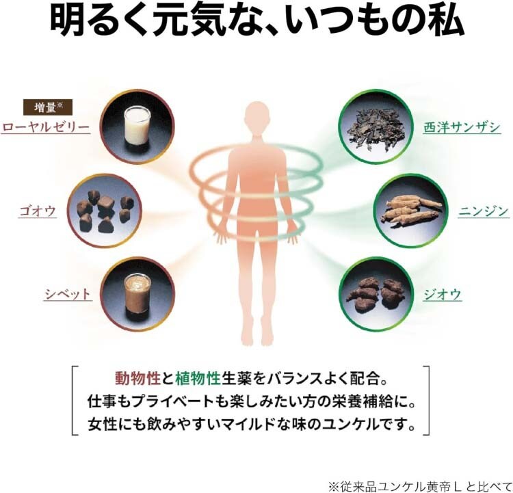 ●ニンジンやローヤルゼリーなどの生薬にビタミンを配合したマイルドな味の滋養強壮ドリンクです。