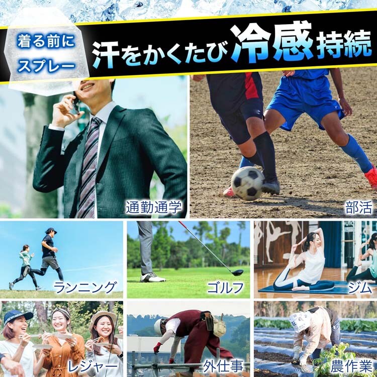 ●通勤・通学などの外出前にシャツなどの衣類に使用すると、屋外でも涼しく快適に過ごせます。