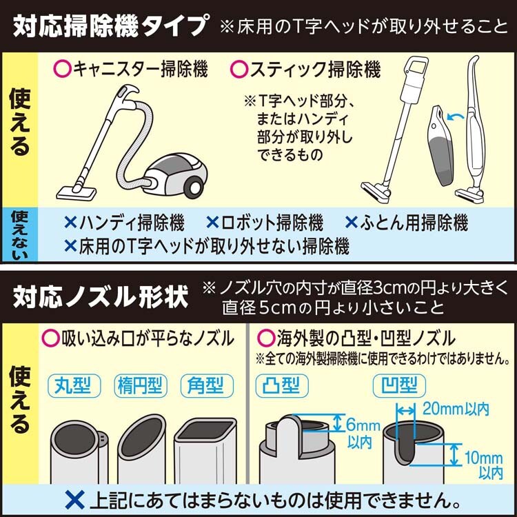 ・ダウン70%以上の羽毛製品に使用できます。羽根製品やフェザーの多い羽毛製品には使用しないでください。(羽根が折れて厚さが戻らなくなったり、圧縮袋をキズつけて空気もれの原因となります。)また、起毛処理された物(毛足の長い物)・皮革製品にも使用しないでください。