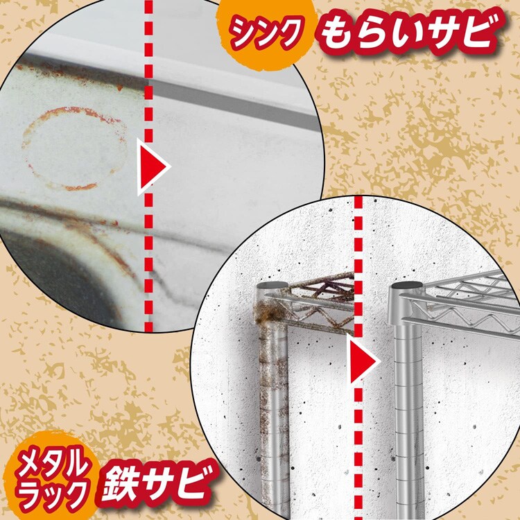 | (用途) 浴室や洗面台に付着したヘアピンなどのもらいサビの除去。 錆びて動かなくなった工具などのサビ除去。 (使えないもの) 大理石、着色するおそれがあるため表面に孔がある材質 |