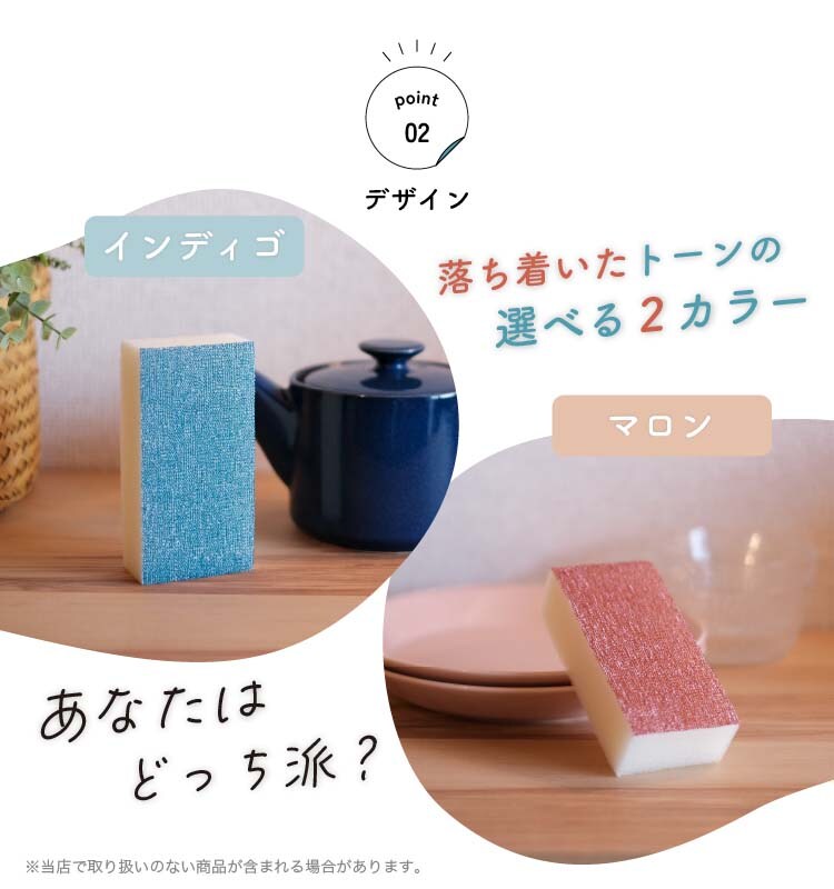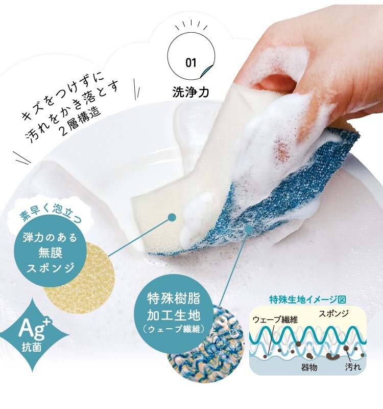 ●特殊樹脂加工のウェーブ繊維が、食器等にキズをつけずに汚れをするんと落とします。