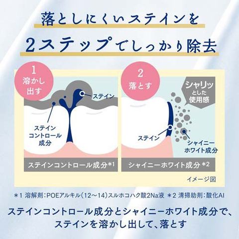 ●シャイニーホワイト成分(清掃助剤)が、清掃剤とともにステイン(着色汚れ)をきめ細かく落として歯面を丁寧に磨きあげ、白くつややかな歯にします。