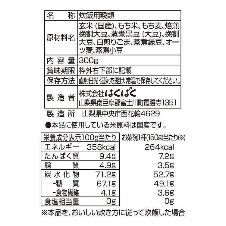 | 玄米(国産)、もち米、もち麦、焙煎挽割大豆、蒸煮黒豆(大豆)、挽割大豆、白煎りごま、蒸煮緑豆、オーツ麦、蒸煮小豆 |