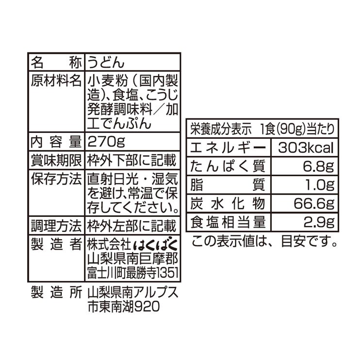 | 90g当たり エネルギー:303kcal、たんぱく質:6.8g、脂質:1.0g、炭水化物:66.6g、食塩相当量:2.9g |