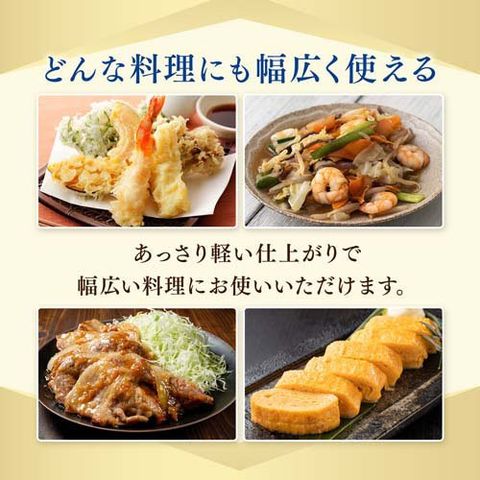 | ・栄養成分表示(大さじ1杯(14g)当たり):熱量126kcal、たんぱく質0g、脂質14g(飽和脂肪酸1g)、炭水化物0g、食塩相当量0g、ビタミンE1.9-4.2mg |