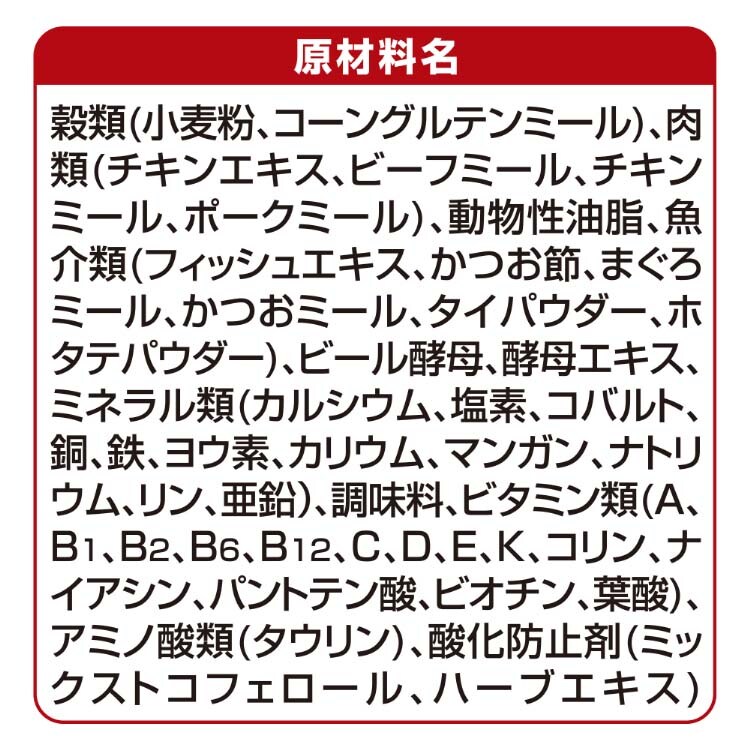 | 穀類(小麦粉、コーングルテンミール)、肉類(チキンエキス、ビーフミール、チキンミール、ポークミール)、動物性油脂、魚介類(フィッシュエキス、かつお節、まぐろミール、かつおミール、タイパウダー、ホタテパウダー)、ビール酵母、酵母エキス、ミネラル類(カルシウム、塩素、コバルト、銅、鉄、ヨウ素、カリウム、マンガン、ナトリウム、リン、亜鉛)、調味料、ビタミン類(A、B1、B2、B6、B12、C、D、E、K、コリン、ナイアシン、パントテン酸、ビオチン、葉酸)、アミノ酸類(タウリン)、酸化防止剤(ミックストコフェロール、ハーブエキス) |