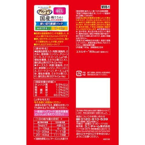 | ★緑黄色野菜入り 肉類(鶏胸肉、ささみ)、野菜類(ニンジン、グリーンピース、スイートコーン)、しょうゆ、増粘多糖類、ミネラル類(Cl、K)、酸化防止剤(EDTA-Ca・Na) ★チーズ入り 肉類(鶏胸肉、ささみ)、野菜類(ニンジン、グリーンピース、スイートコーン)、チーズ、しょうゆ、増粘多糖類、ミネラル類(Cl、K)、酸化防止剤(EDTA-Ca・Na) |