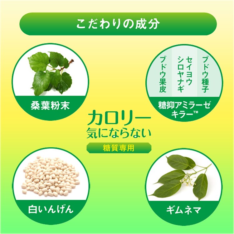 | 桑の葉粉末(国内製造)、マルトデキストリン、ギムネマシルベスタエキス末、白いんげん豆抽出物、サラシアエキス末、ブドウ果皮エキス末、セイヨウシロヤナギエキス末、ブドウ種子エキス末/ヒドロキシプロピルメチルセルロース、ショ糖脂肪酸エステル、微粒二酸化ケイ素、増粘剤(アラビアガム)、V.B1、V.B2、V.B6 |