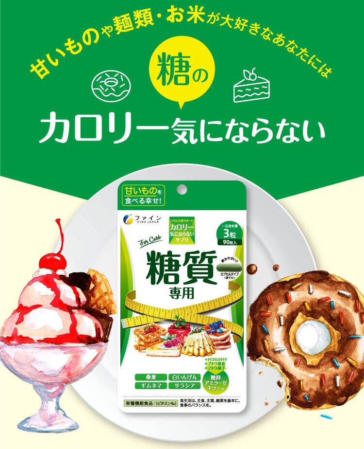 | 3粒当たり(被包材込み) エネルギー:4.6kcal、たんぱく質:0.12g、脂質:0.06g、炭水化物:0.89g、食塩相当量:0.0015g、ビタミンB6:1.0mg 桑葉粉末:500mg、ギムネマシルベスタエキス末:100mg、白いんげん豆抽出物:100mg、サラシアエキス末:20mg、糖抑アミラーゼキラー(セイヨウシロヤナギ、ブドウ果皮、ブドウ種子):20mg ※糖抑アミラーゼキラーはファインの商標です。 |