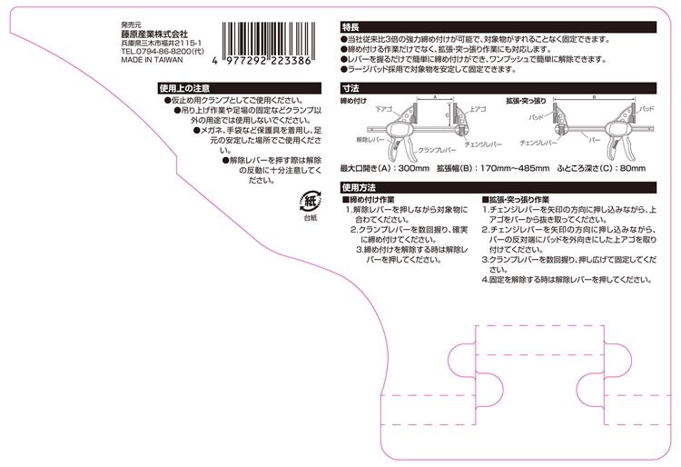 | ・用途:長物の固定 ・口開き:300mm ・最大締付力:150kg ・本体:ナイロン+グラスファイバー ・パッド:TPR樹脂 ・ハンドル握り部:TPR樹脂 ・サイズ:幅500×高さ220×奥行35mm ・重量:770g |