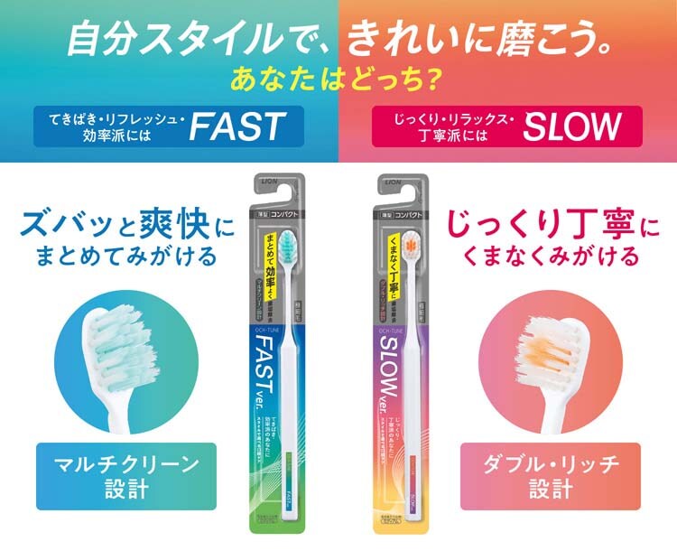 ●「OCH-TUNEハブラシ FAST」はズバっと爽快に、歯面やすき間をまとめてみがける「マルチクリーン設計」のハブラシ。