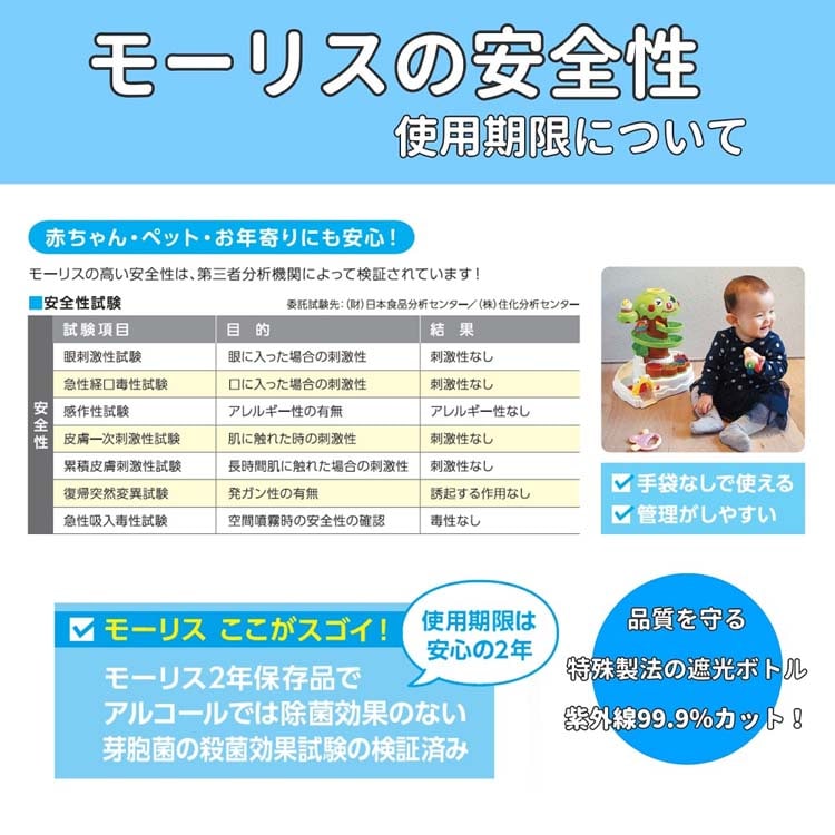 使用場所・・・テーブル、ドアノブ、スイッチ、トイレ(便座、床、壁、手すり)、まな板、調理器具、冷蔵庫、台ふきん、おもちゃ、ペットまわり、介護用品