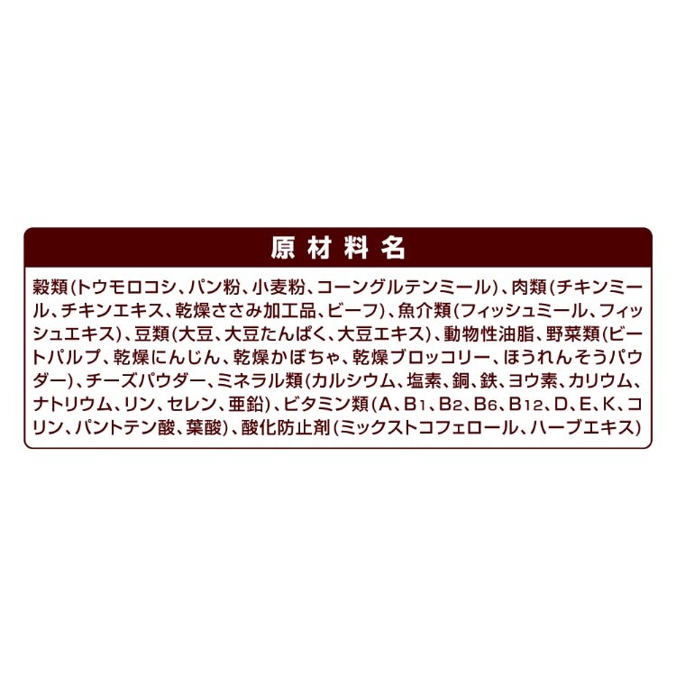 | 穀類(トウモロコシ、パン粉、小麦粉、コーングルテンミール)、肉類(チキンミール、チキンエキス、乾燥ささみ加工品、ビーフ)、魚介類(フィッシュミール、フィッシュエキス)、豆類(大豆、大豆たんぱく、大豆エキス)、動物性油脂、野菜類(ビートパルプ、乾燥にんじん、乾燥かぼちゃ、乾燥ブロッコリー、ほうれんそうパウダー)、チーズパウダー、ミネラル類(カルシウム、塩素、銅、鉄、ヨウ素、カリウム、ナトリウム、リン、セレン、亜鉛)、ビタミン類(A、B1、B2、B6、B12、D、E、K、コリン、パントテン酸、葉酸)、酸化防止剤(ミックストコフェロール、ハーブエキス) |