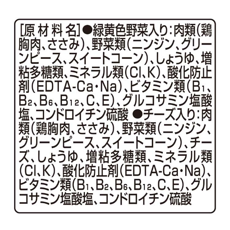 | ★緑黄色野菜入り 肉類(鶏胸肉、ささみ)、野菜類(ニンジン、グリーンピース、スイートコーン)、しょうゆ、増粘多糖類、ミネラル類(Cl、K)、酸化防止剤(EDTA-Ca・Na)、ビタミン類(B1、B2、B6、B12、C、E)、グルコサミン塩酸塩、コンドロイチン硫酸 ★チーズ入り 肉類(鶏胸肉、ささみ)、野菜類(ニンジン、グリーンピース、スイートコーン)、チーズ、しょうゆ、増粘多糖類、ミネラル類(Cl、K)、酸化防止剤(EDTA-Ca・Na)、ビタミン類(B1、B2、B6、B12、C、E)、グルコサミン塩酸塩、コンドロイチン硫酸 |
