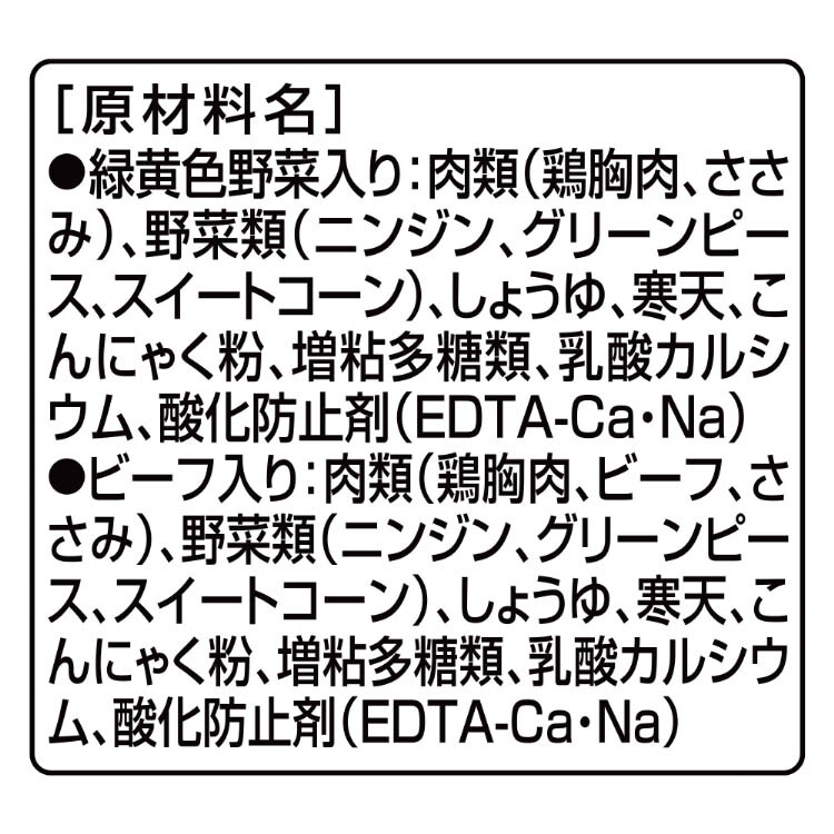 | ★緑黄色野菜入り 肉類(鶏胸肉、ささみ)、野菜類(ニンジン、グリーンピース、スイートコーン)、しょうゆ、寒天、こんにゃく粉、増粘多糖類、乳酸カルシウム、酸化防止剤(EDTA-Ca・Na) ★ビーフ入り 肉類(鶏胸肉、ビーフ、ささみ)、野菜類(ニンジン、グリーンピース、スイートコーン)、しょうゆ、寒天、こんにゃく粉、増粘多糖類、乳酸カルシウム、酸化防止剤(EDTA-Ca・Na) |