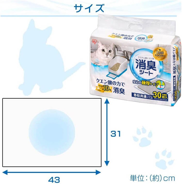 | 素材 ・表面材:ポリオレフィン系不識布 ・吸水材:吸水紙、高分子吸収体、綿状パルプ ・防水材:ポリエチレンフィルム ・接着剤:ホットメルト粘着材 ・外装材:ポリエチレンフィルム 製品サイズ(cm) ・幅約43*奥行約31 枚数 ・30枚 ・消臭シート交換の目安 ・成猫1匹:約1週間 ・成猫2匹:約3~4日 ※猫の状態、季節により交換の時期は異なります。 |