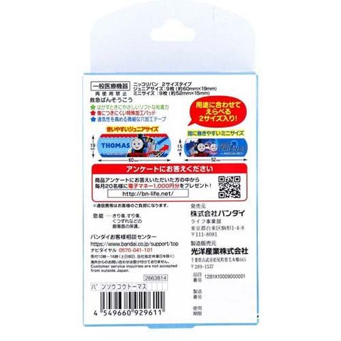| ・個装重量:約16g ・セット内容:ジュニアサイズばんそうこう*9枚、ミニサイズばんそうこう*9枚 ・素材 テープ:ポリオレフィン パッド:ポリオレフィン、レーヨン ・サイズ ジュニアサイズ:約60mm*19mm ミニサイズ:約52mm*15mm |