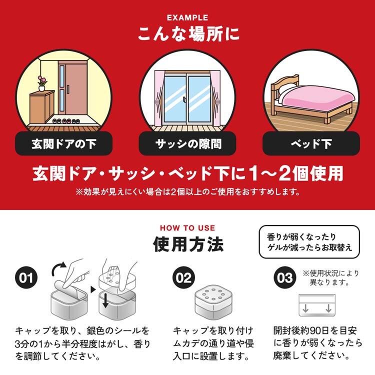 ・効果は約90日間だが、使用条件によっては短くなる場合がある。香りが弱くなったら取り替える。