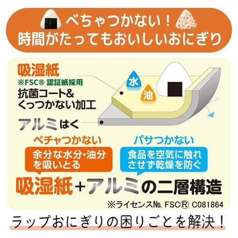 ●アルミはくに吸湿紙を貼り合わせていますので、おにぎりのベチャつきやパサつきを防ぎます。