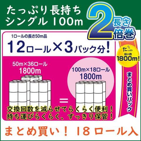 ●たっぷり長持ち長さ2倍巻(※)で、トイレットロールの交換回数を減らせます。保管スペースを取らずにすっきり収納できます。