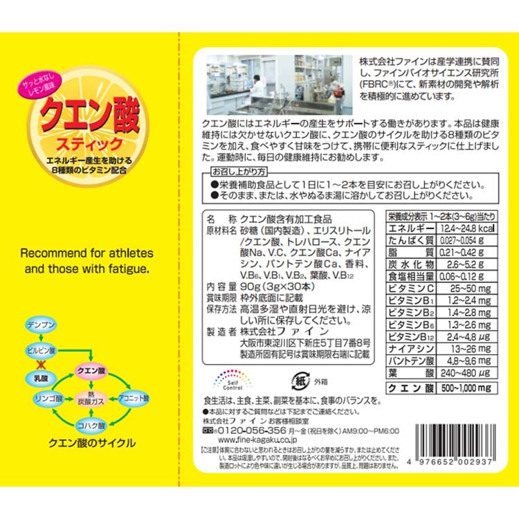 ●本品は健康維持には欠かせないクエン酸に、クエン酸のサイクルを助ける8種類のビタミンを加え、食べやすく甘味をつけて、携帯に便利なスティックに仕上げました。