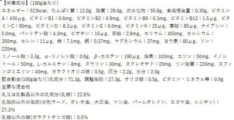 | 調整食用油脂(分別ラード、オレオ油、大豆油、ヤシ油、パームオレイン)(国内製造)、ホエイパウダー、乳糖、脱脂粉乳、たんぱく質濃縮ホエイパウダー、ガラクトオリゴ糖、エゴマ油/レシチン、塩化カルシウム、水酸化カルシウム、ビタミンC、タウリン、イノシトール、硫酸第一鉄、硫酸亜鉛、5'-シチジル酸、ビタミンE、5'-ウリジル酸ナトリウム、ニコチン酸アミド、パントテン酸カルシウム、5'-アデニル酸、5'-イノシン酸ナトリウム、5'-グアニル酸ナトリウム、硫酸銅、ビタミンB1、ビタミンA、ビタミンB2、ビタミンB6、β-カロテン、葉酸、ビオチン、ビタミンD3、ビタミンB12、(一部に乳成分・大豆を含む) |