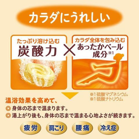 | ★「ゆずの香り」 炭酸水素ナトリウム*、炭酸ナトリウム*、硫酸マグネシウム*、硫酸ナトリウム(無水)*、フマル酸、PEG6000、ブドウ糖、グリシン、酸化マグネシウム、ショ糖脂肪酸エステル、デキストリン、ケイ酸Ca、香料、黄4 *は「有効成分」、無表示は「その他の成分」 ★「きんかんの香り」、「みかんの香り」、「すだちの香り」 炭酸水素ナトリウム*、炭酸ナトリウム*、硫酸マグネシウム*、硫酸ナトリウム(無水)*、フマル酸、PEG6000、ブドウ糖、グリシン、酸化マグネシウム、ショ糖脂肪酸エステル、ミリスチン酸イソプロピル、香料、(+/-)青1、黄4、赤102、赤106、赤227 *は「有効成分」、無表示は「その他の成分」 |