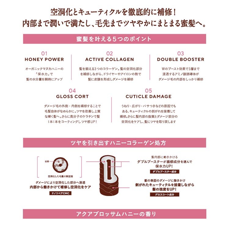 ●髪内部の水分量を保持するオーガニックマヌカハニー*1や、髪のダメージをケアする3種のコラーゲン*3など、髪本来の輝きを魅き出す美髪成分を厳選して配合。