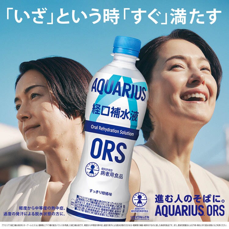 許可表示:アクエリアス 経口補水液ORS(オーアールエス)」は、電解質とブドウ糖の配合バランスを考慮した経口補水液です。病者用食品として表示許可を得た本製品は、軽度から中等度の熱中症、過度の発汗による脱水状態の方が水分・電解質の補給・維持をするのに適しているほか、感染性胃腸炎による下痢・嘔吐に伴う脱水状態にも利用できます。