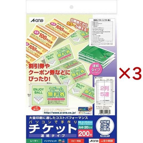 エーワン 手作り チケット ミシン目 2列5連 連続 51468 (20シート×3セット)