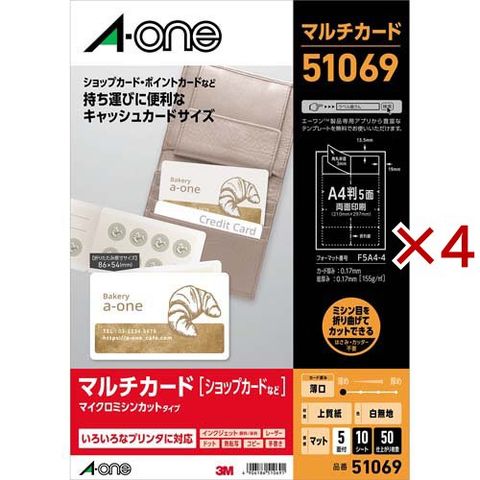 エーワン 名刺 カード ミシン目 キャッシュカードサイズ 横 2つ折り 白 51069 (10シート×4セット)