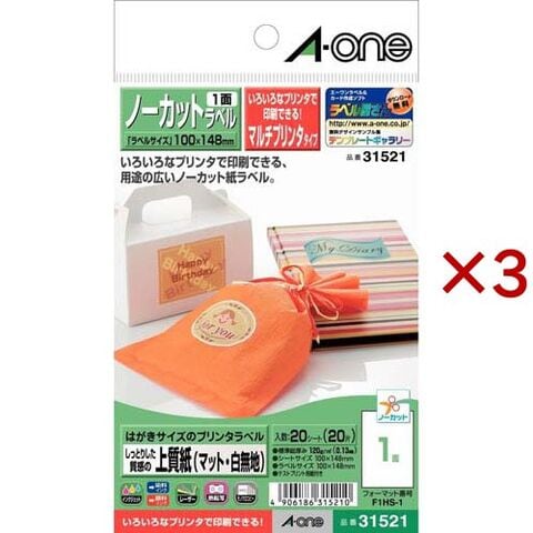 エーワン ラベルシール はがきサイズ 1面 ノーカット 100×148mm 31521 (20シート×3セット)