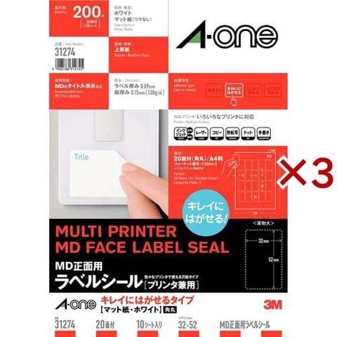 エーワン ラベルシール きれいにはがせる 20面 32×52mm 31274 (10シート×3セット)