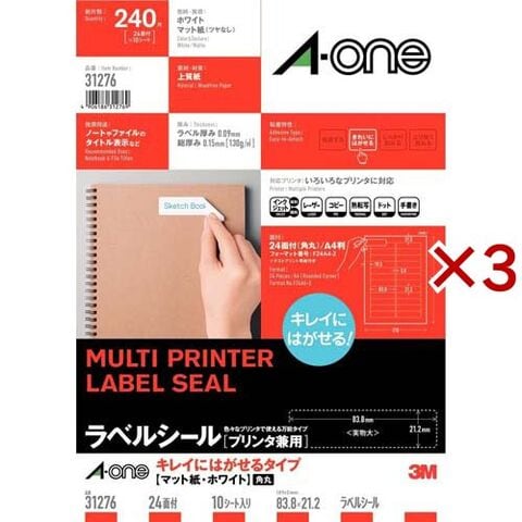 エーワン ラベルシール きれいにはがせる 24面 83.8×21.2mm 31276 (10シート×3セット)