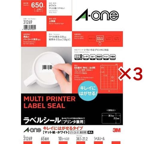 エーワン ラベルシール きれいにはがせる 65面 38.1×21.2mm 31269 (10シート×3セット)