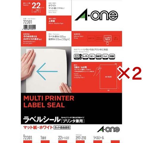 エーワン ラベルシール 1面 ノーカット 72301 (22シート×2セット)