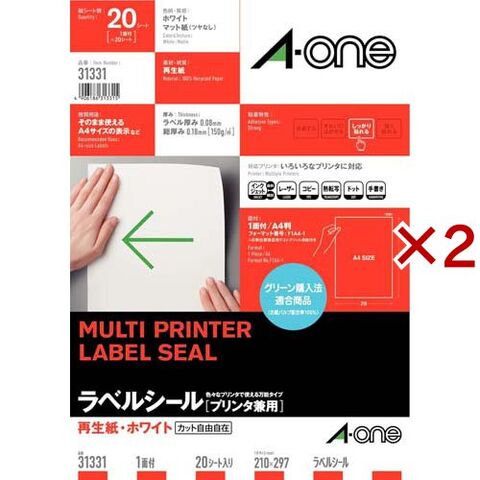 エーワン ラベルシール 再生紙 1面 ノーカット 210×297mm 31331 (20シート×2セット)