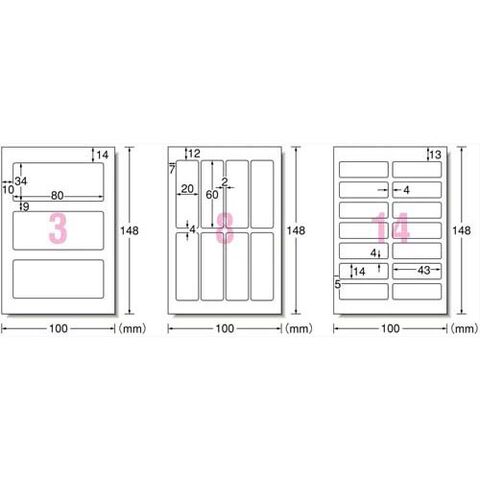 | ★3面 シートサイズ・・・はがきサイズ(100*148mm) 一片サイズ・・・80mm*34mm 面付・・・3面1列*3段 厚み・・・0.31mm ラベル厚み・・・0.235mm ★8面 シートサイズ・・・はがきサイズ(100*148mm) 一片サイズ・・・20mm*60mm 面付・・・8面4列*2段 厚み・・・0.31mm ラベル厚み・・・0.235mm ★14面 シートサイズ・・・はがきサイズ(100*148mm) 一片サイズ・・・43mm*14mm 面付・・・14面2列*7段 厚み・・・0.31mm ラベル厚み・・・0.235mm |