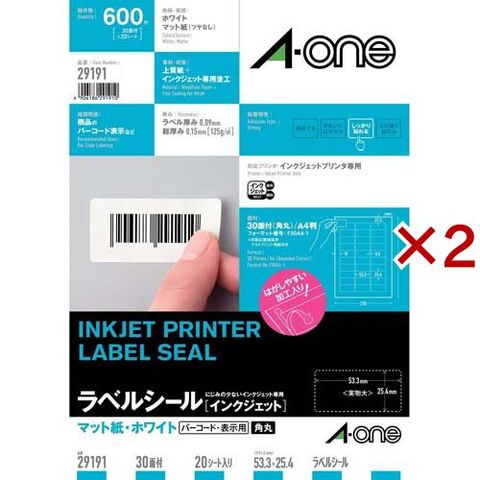 エーワン ラベルシール インクジェット 30面 53.3×25.4mm 29191 (20シート×2セット)