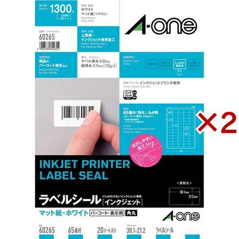 エーワン ラベルシール インクジェット 65面 38.1×21.2mm 60265 (20シート×2セット)
