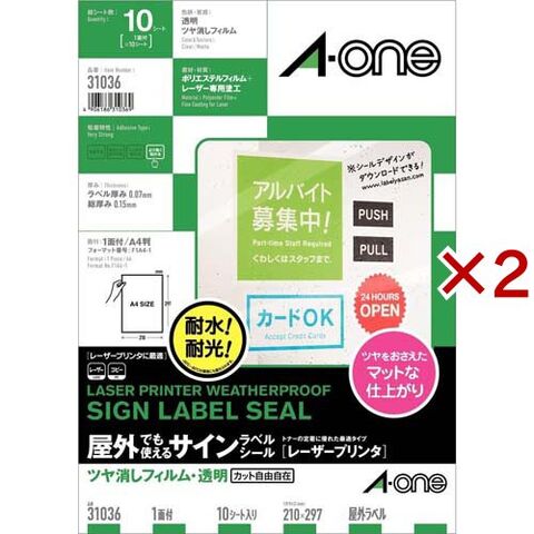 エーワン 屋外使える ラベル レーザー つや消し フィルム 透明 A4 1面 31036 (10シート×2セット)