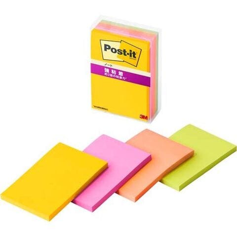 ●強粘着タイプのポスト・イット(R)ノートです。パソコンのデスクトップやキャビネット、樹脂製品などつきにくかった場所にしっかり貼れます。