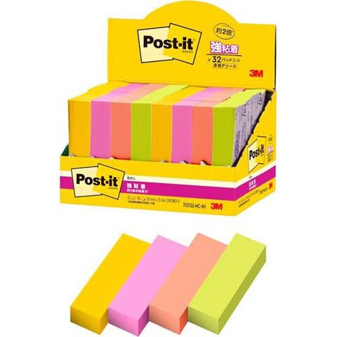 ●強粘着タイプのポスト・イット(R)ノートです。パソコンのデスクトップやキャビネット、樹脂製品などつきにくかった場所にしっかり貼れます。