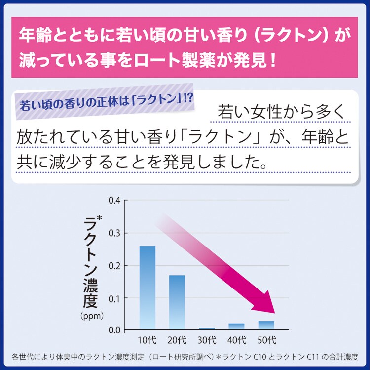 ●年齢とともに減少する甘い香りの成分「ラクトン」を含有する香料を配合し、スウィートフローラルの香りが続きます。