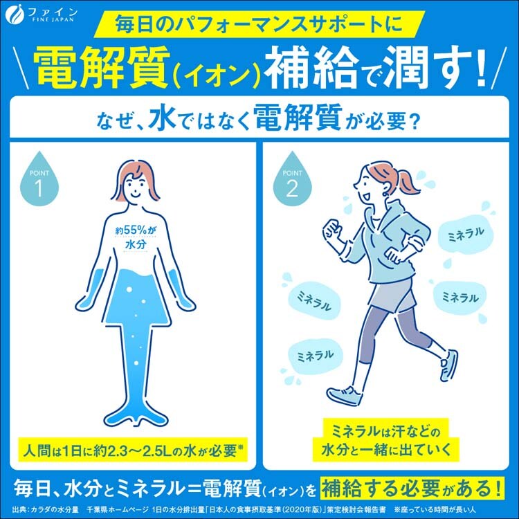 ●水やお茶に含まれない電解質が含まれますので、水分吸収効率が良く、熱中時の対策にも。