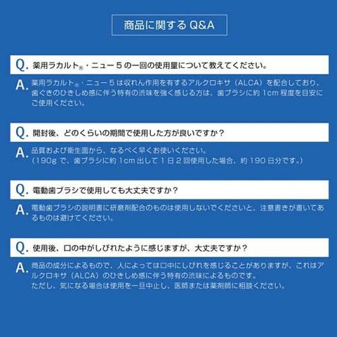 | アルクロキサ 収れん作用でゆるんだ歯ぐきをひきしめます。 クロルヘキシジングルコン酸塩液 歯周病菌の発育を阻止し、歯垢の形成を抑えます。 ポリリン酸ナトリウム 唾液中のカルシウムイオンをとらえ、歯石の沈着を抑制します。 |