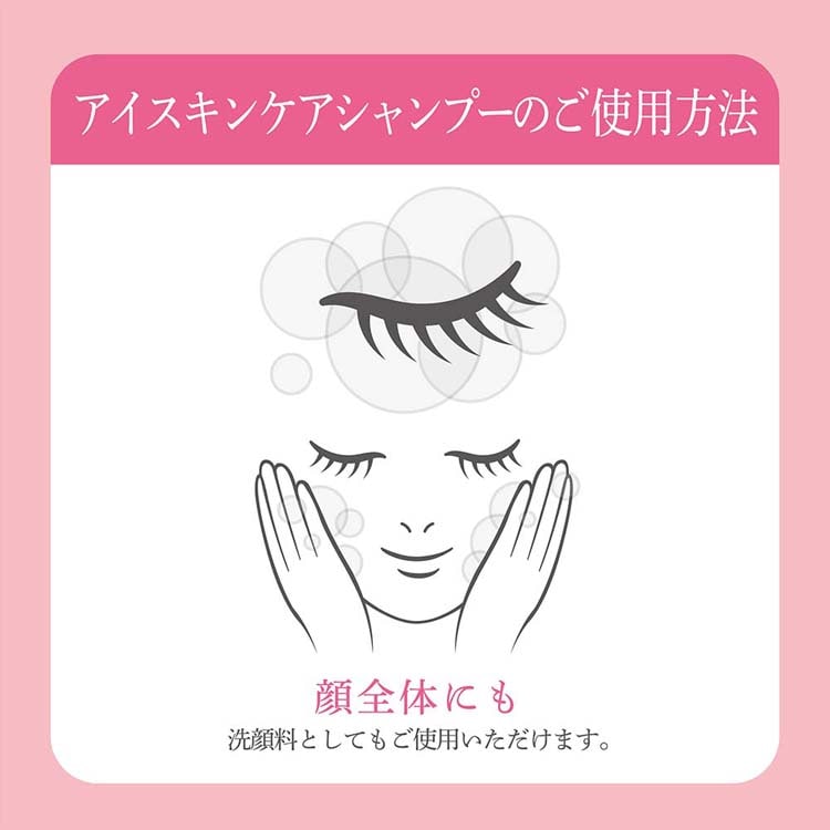 メイク落とし・洗顔料を使ったあとにご使用ください。適量(2~3プッシュ)を手にとり、目元全体を包み込むように泡を乗せ、まぶたからまつ毛の毛先にかけてやさしく洗い、十分にすすいでください。