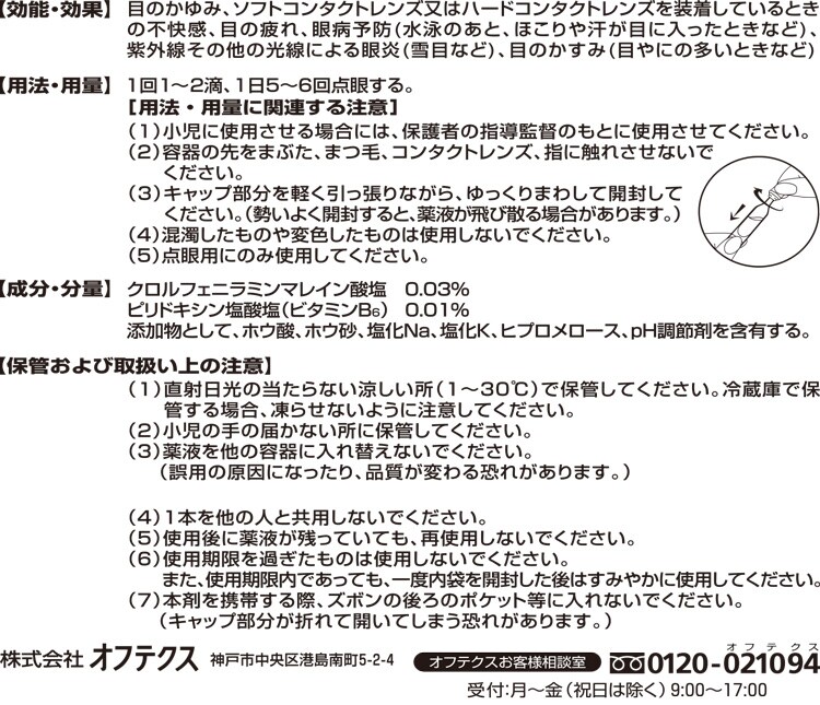 | クロルフェニラミンマレイン酸塩:0.03%、ピリドキシン塩酸塩(ビタミンB6):0.01% 添加物として、ホウ酸、ホウ砂、塩化Na、塩化K、ヒプロメロース、pH調節剤を含有する。 |
