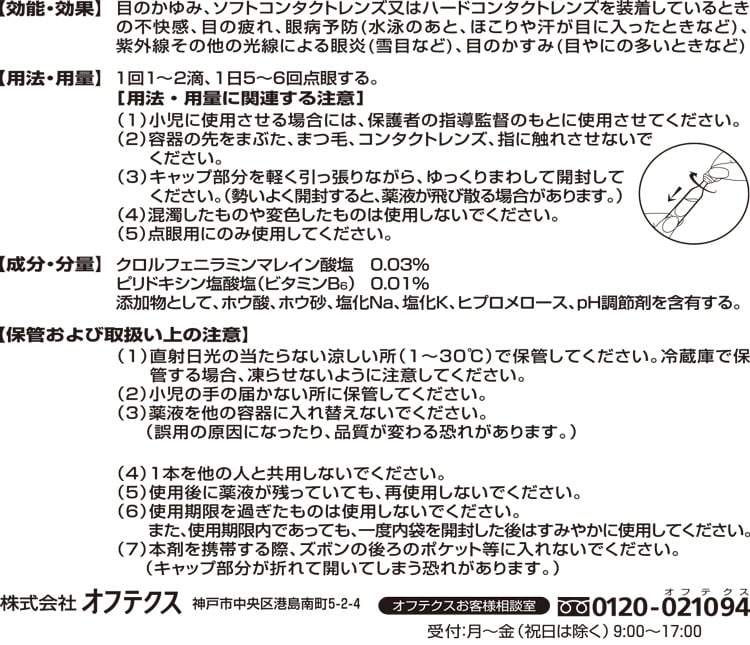 | 目のかゆみ、ソフトコンタクトレンズ又はハードコンタクトレンズを装着しているときの不快感、目の疲れ、眼病予防(水泳のあと、ほこりや汗が目に入ったときなど)、紫外線その他の光線による眼炎(雪目など)、目のかすみ(目やにの多いときなど) |